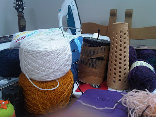 The set-up for seaming and finishing includes equipment for blocking and pressing, including a large blocking board. We have copious supplies of darning needles, pins, the right yarns for sewing the right garments, and of course, the making-up instructions. The guitar in the background is entirely optional, but I find that listening to some podcasts or a bit of Tim Minchin helps it along!